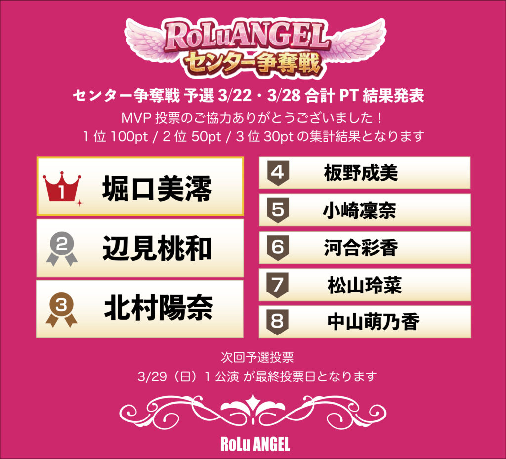 3月22日(日)& 3月28日(土)の定期公演にて実施いたしました「センター争奪戦」予選MVP投票の合計ポイント数ランキング結果をお知らせいたします。